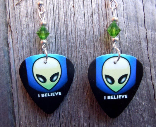I Believe Alien Guitar Pick Earrings with Green Swarovskis