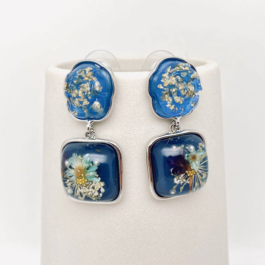 Queen Anne's Lace & Chrysanthemum Dried Flower Blue Earrings
