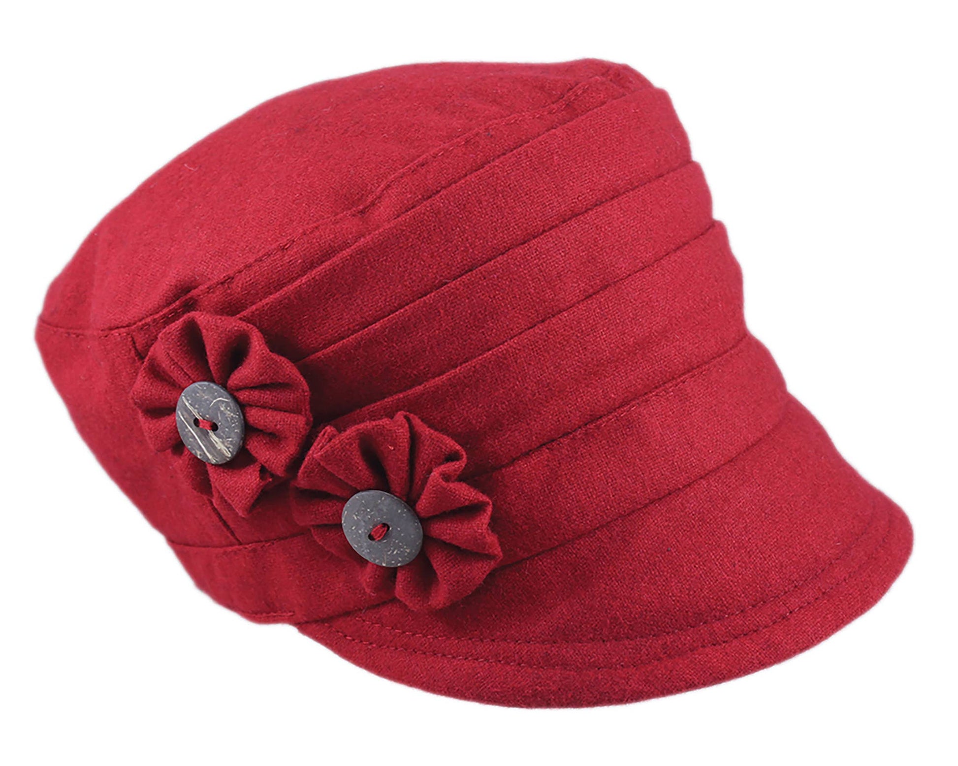 Women's Hat- Polyester, pleated cap, two flower accent with coconut buttons, fleece lining, elastic back, 57cm..