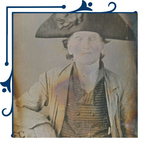 This rare photograph of a Revolutionary veteran depicts Portsmouth's George Fishley (1759-1850), who served under George Washington at the Battle of Monmouth and spent time as a prisoner of war in Halifax, Nova Scotia. In later years Fishley, wearing his Revolutionary uniform, became a regular feature of local parades.