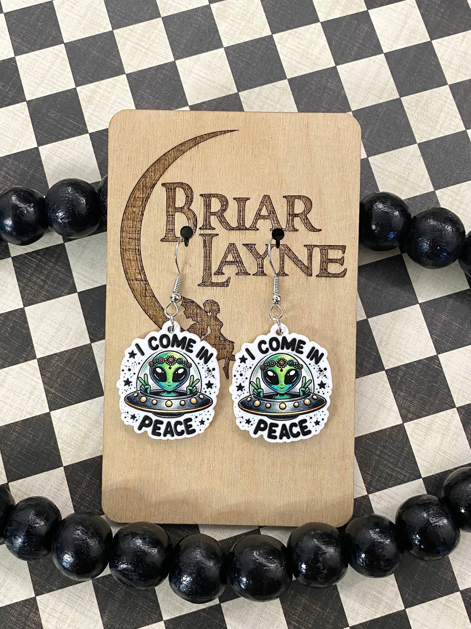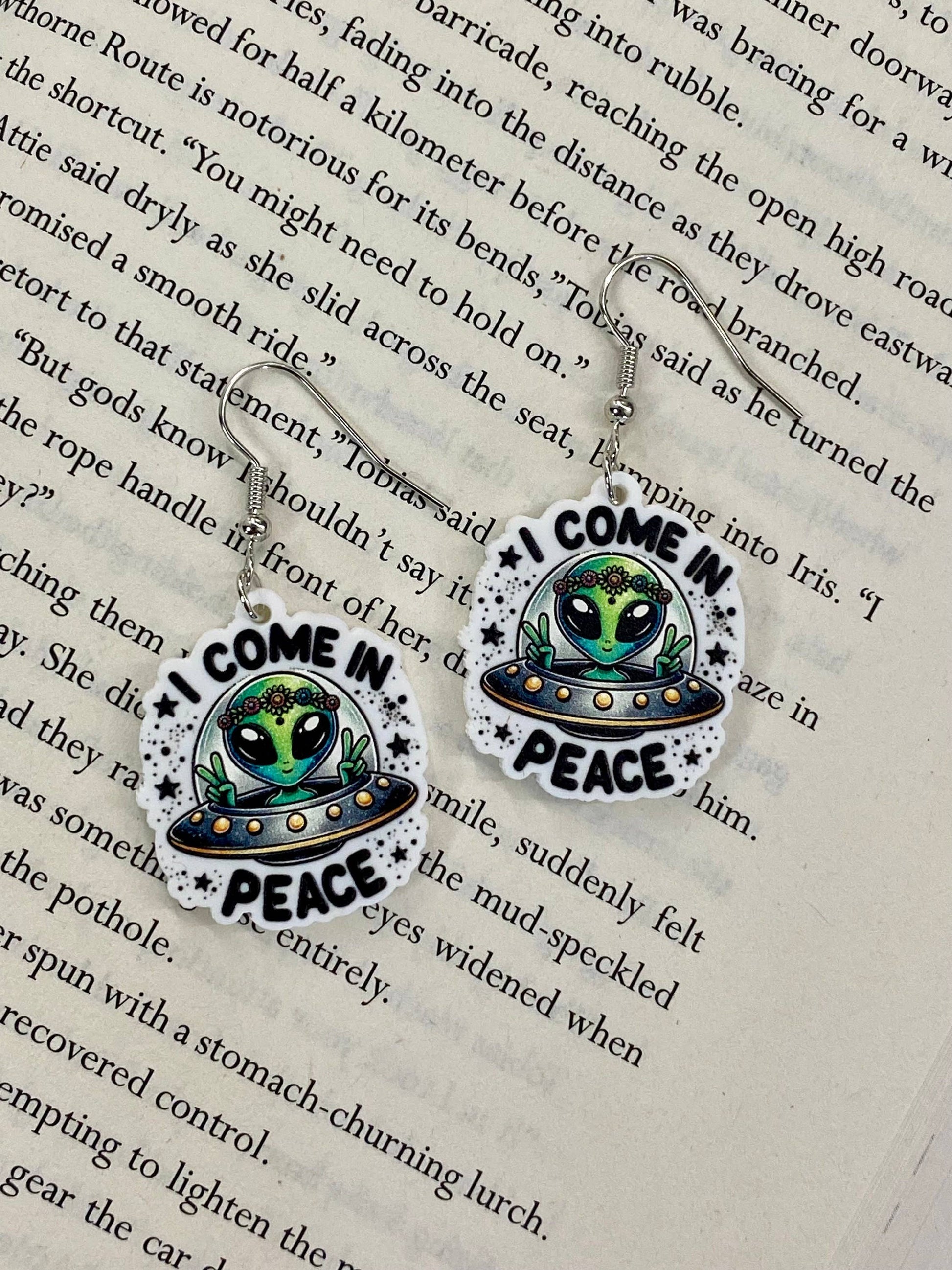 Alien Sci-Fi Book Earrings "I Come In Peace