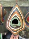 Part of the parametric design series, this birdhouse is made from blending two different shapes together, layered to add depth to the house. Each house includes a removable panel to clean the house between guests, and a hole in the bottom for drainage. Dimensions: 4.” deep, 7” wide, 9” high. Select from rainbow or 1970s color themes. Note — each house is a bit different from another.