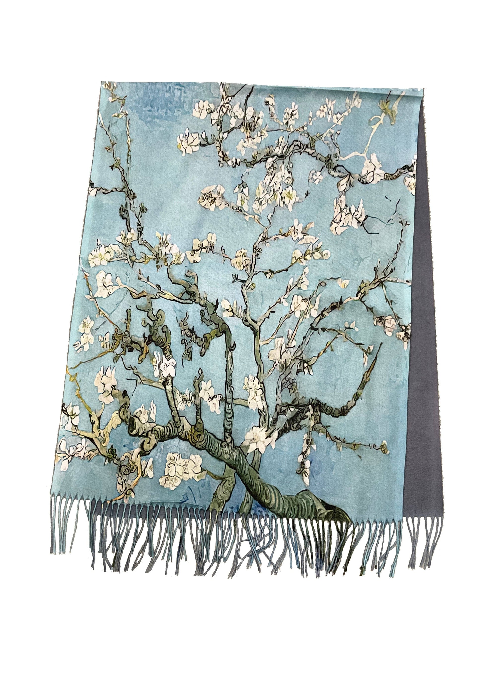 Each scarf has painting on one side and solid color on the back. Dimensions: 70 x 180 cm Material: 100% Polyester