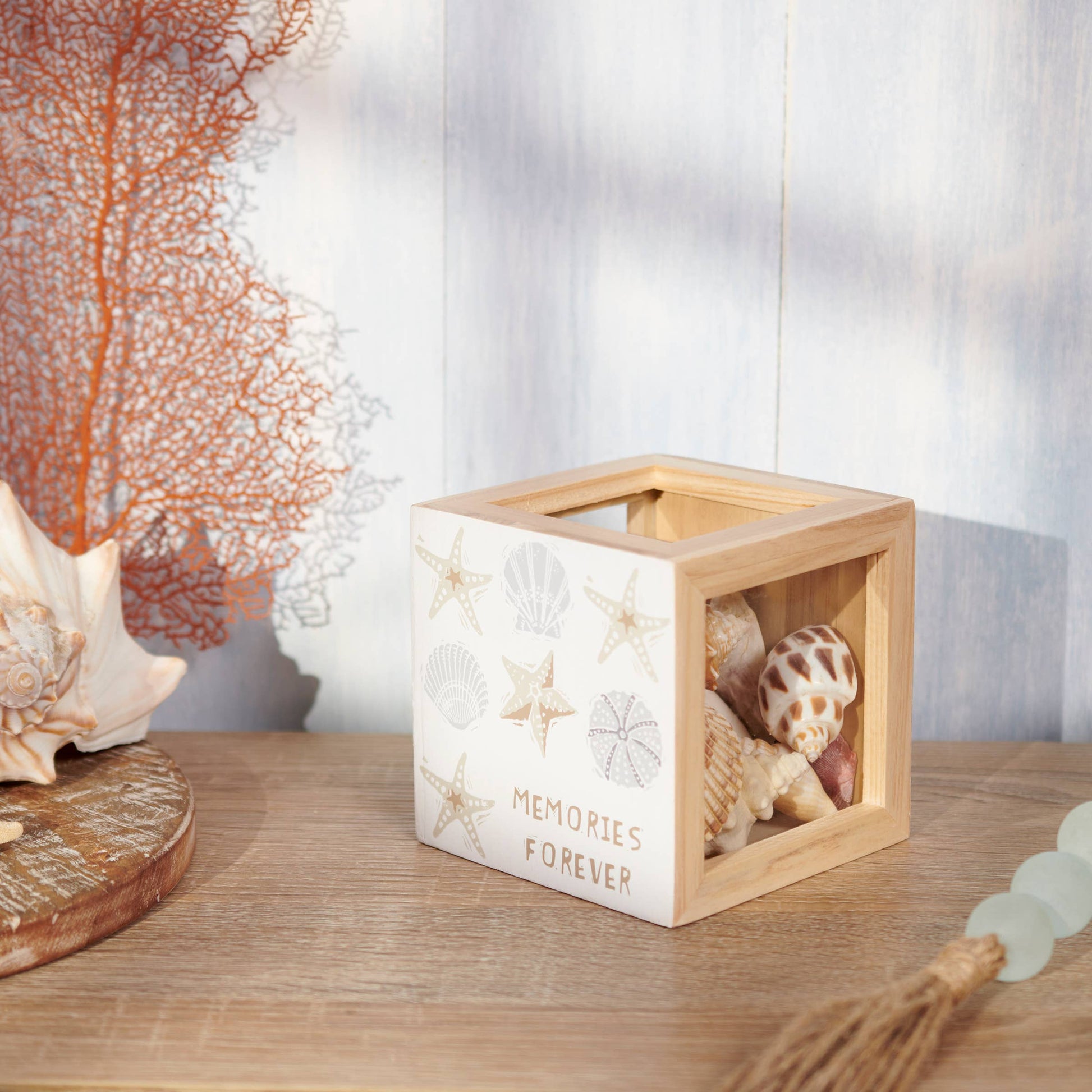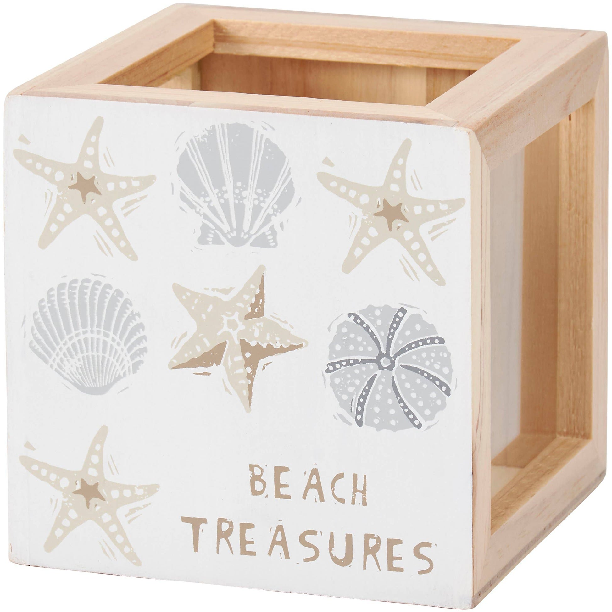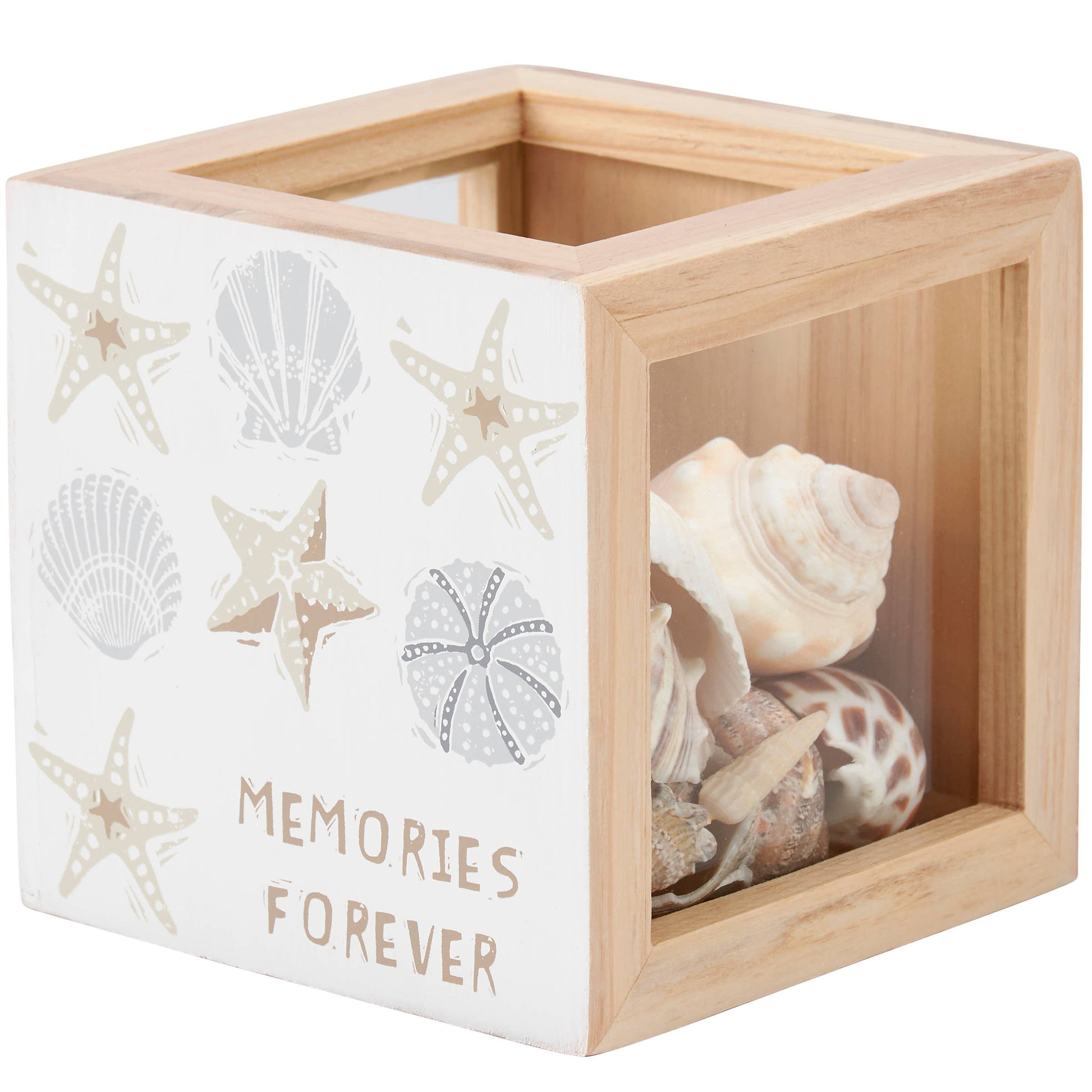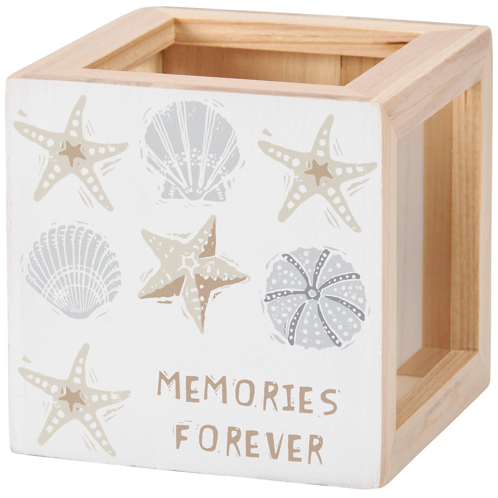 A double-sided wooden seashell holder from our Beach Collection displaying seashell designs in a unique block print art style on each side. Each side features different beach-themed sentiments that read "Beach Treasures" and "Memories Forever." Our Beach Treasures shell holder includes side panel glass windows to view keepsakes and a top opening to drop items in. A fun beach-themed gift to display keepsakes as everyday home décor.
