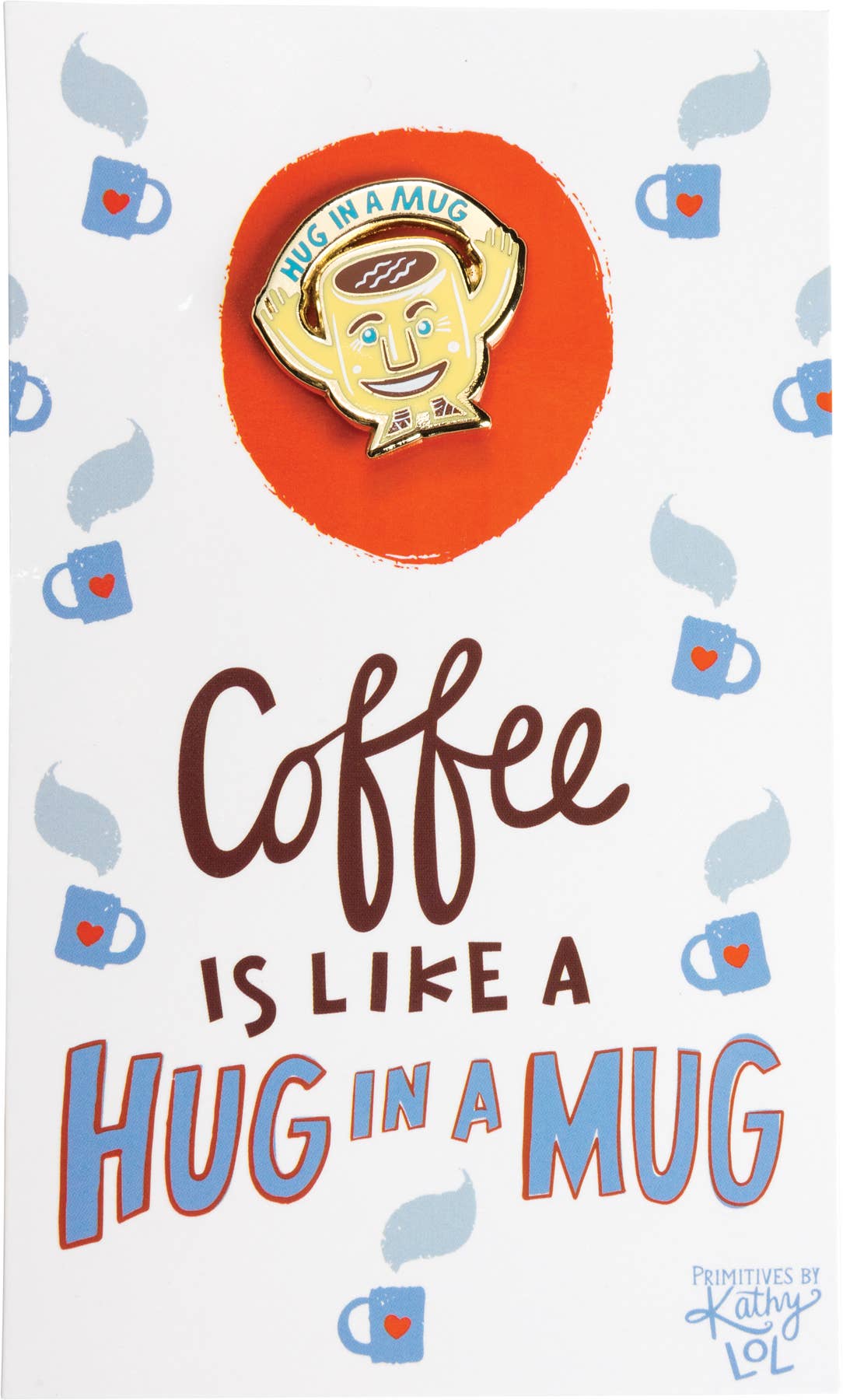 A "Hug In A Mug" high-quality hard enamel pin lending a personified coffee mug design with a butterfly clip closure. Comes packaged on a thoughtfully-coordinated card with "Coffee Is Like A Hug In A Mug" sentiment and double-sided coffee mug pattern with an intentional blank back to personalize with a handwritten note for gifting.