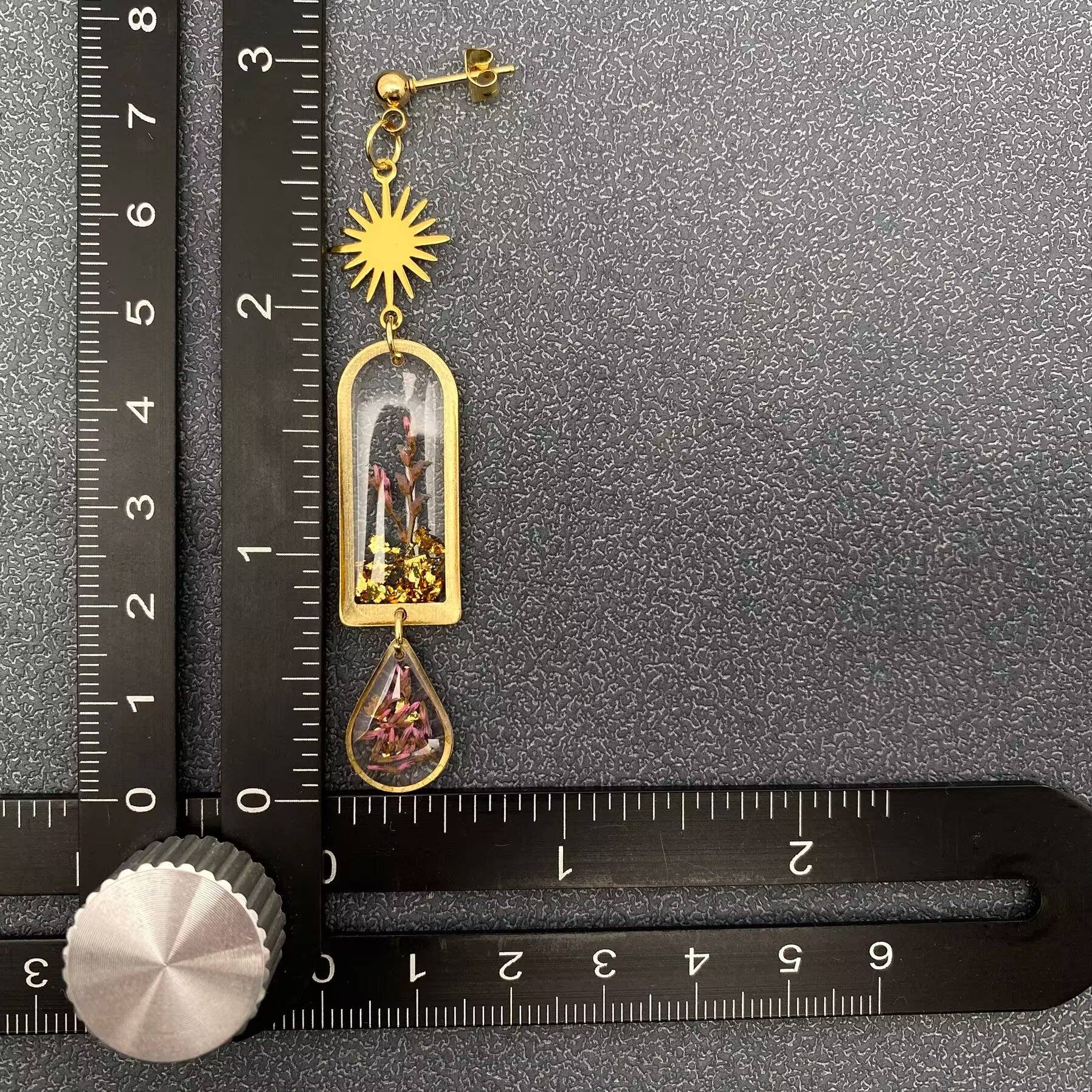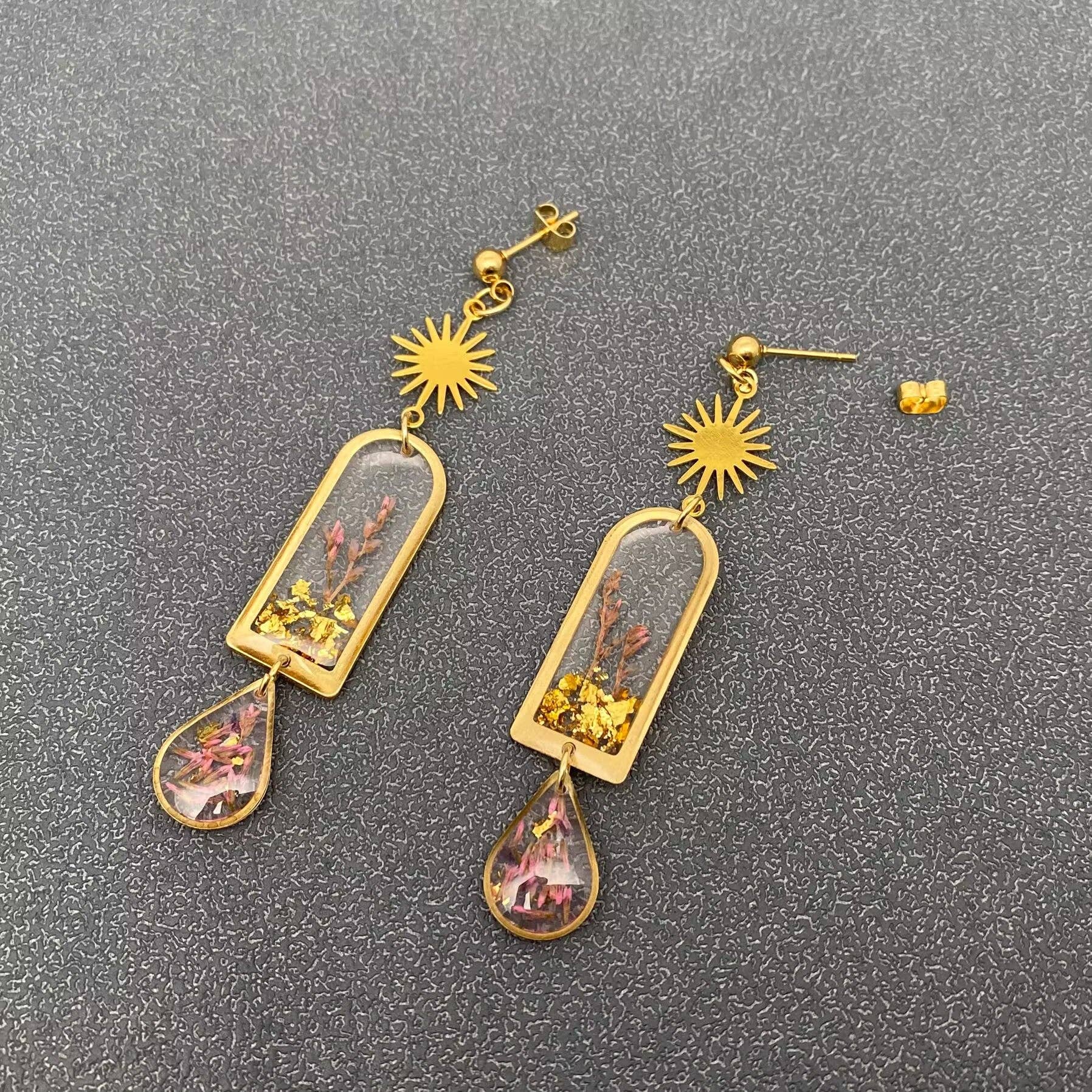 Dried flowers, resin, brass charm ,18K gold plated stainless steel post Size: 15mm * 74mm They are all made by pressed genuine flowers, and each flower is different. During the curing process of resin, there may be a small amount of tiny bubbles, which is a normal phenomenon. If you mind this, please do not purchase. Thank you!