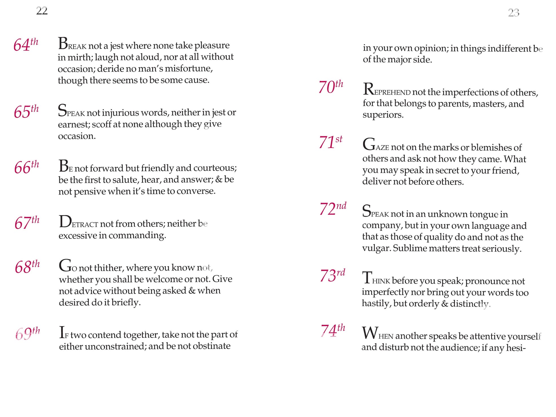 Copied out by hand as a young man aspiring to the status of Gentleman, George Washington's 110 rules were based on a set of rules composed by French Jesuits in 1595. The first English edition of these rules was available in Francis Hawkins' Youths Behavior, or Decency in Conversation Amongst Men, which appeared in 1640, and it is from this work that Washington seems to have copied. The rules as Washington wrote them out are a simplified version of this text.