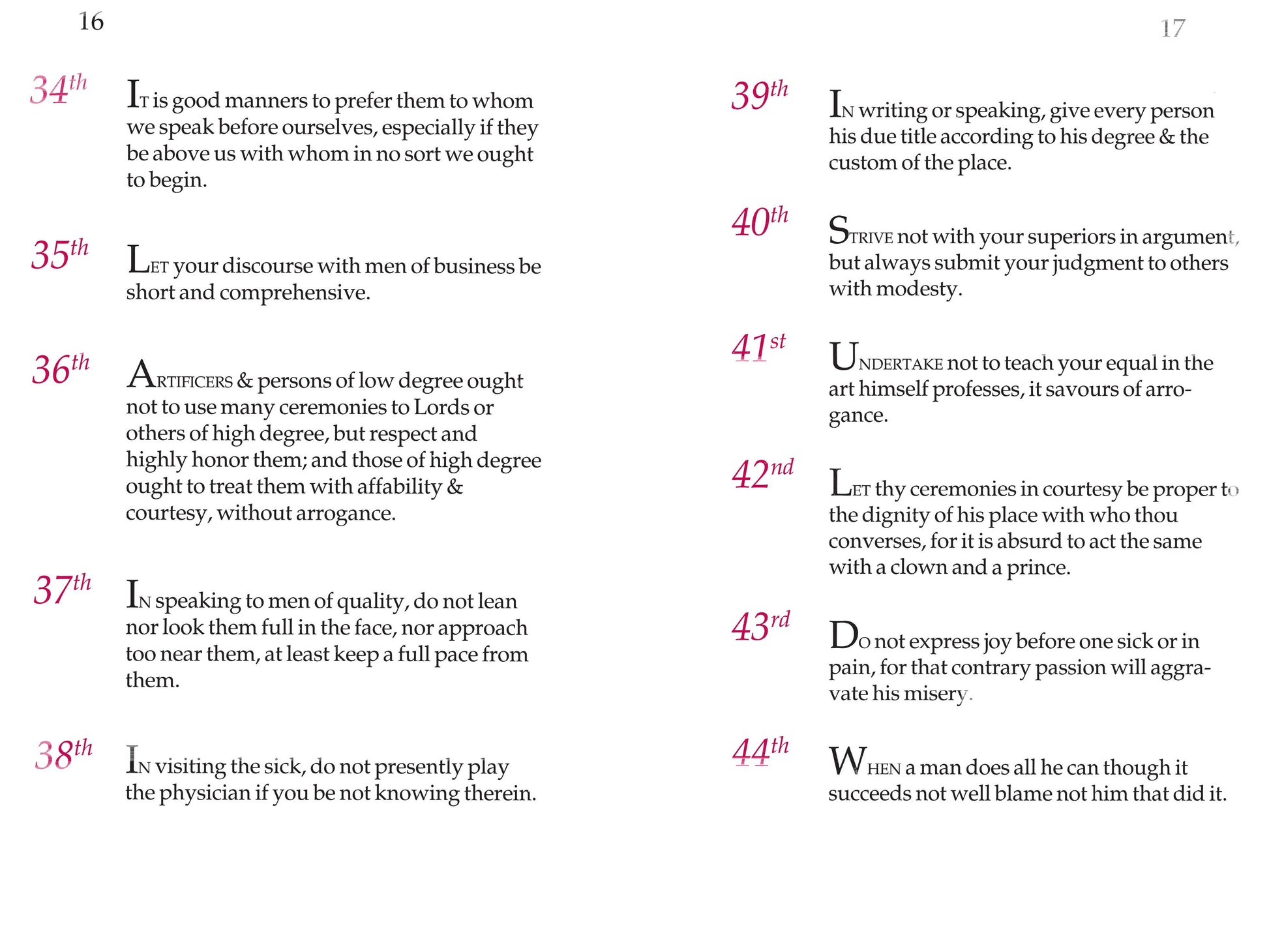 However, much he may have simplified them, these precepts had a strong influence on Washington, who aimed to always live by them. The rules focus on self-respect and respect for others through details of etiquette. The rules offer pointers on such issues as how to dress, walk, eat in public, and address one's superiors.