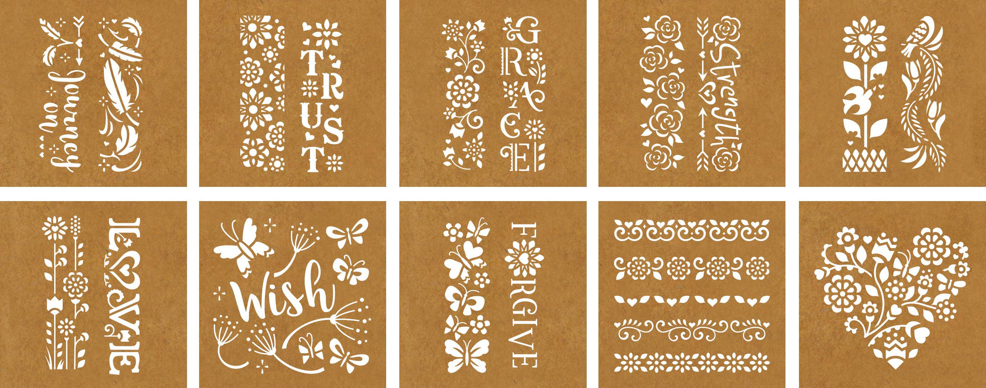 Create beautiful DIY inspirational paper crafts with these reusable paper stencils. Designer patterns are perfect for embellishing.