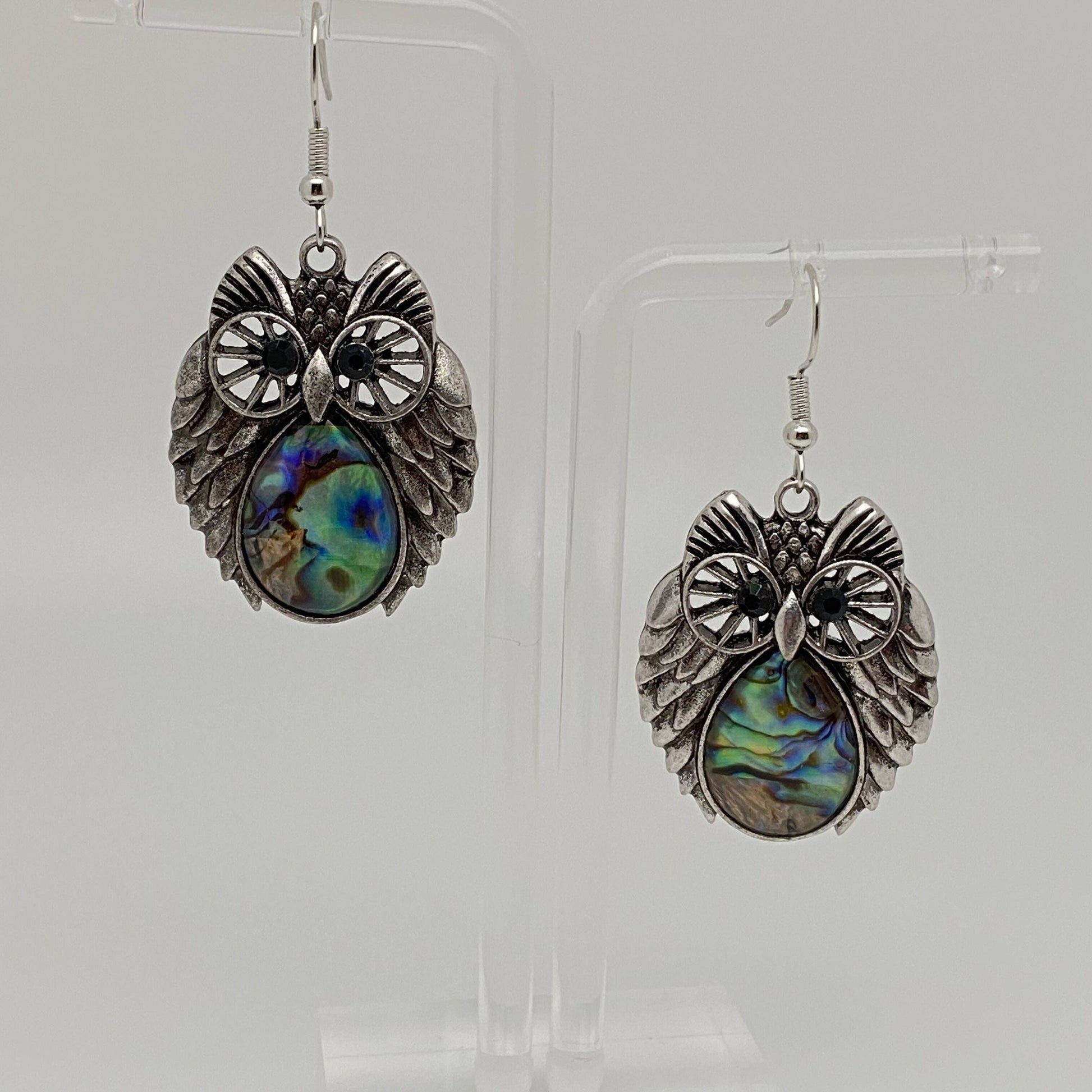 Elevate your style with these unique earrings featuring owl, elephant, and geometric designs. Adorned with beautiful abalone shell accents, they add a touch of natural beauty and iridescence to your look. Perfect for making a statement, these earrings are a stylish and eye-catching accessory. Embrace your love for animals and geometric shapes with these stunning abalone shell earrings. Material: Silver tone metal , Abalone shell
