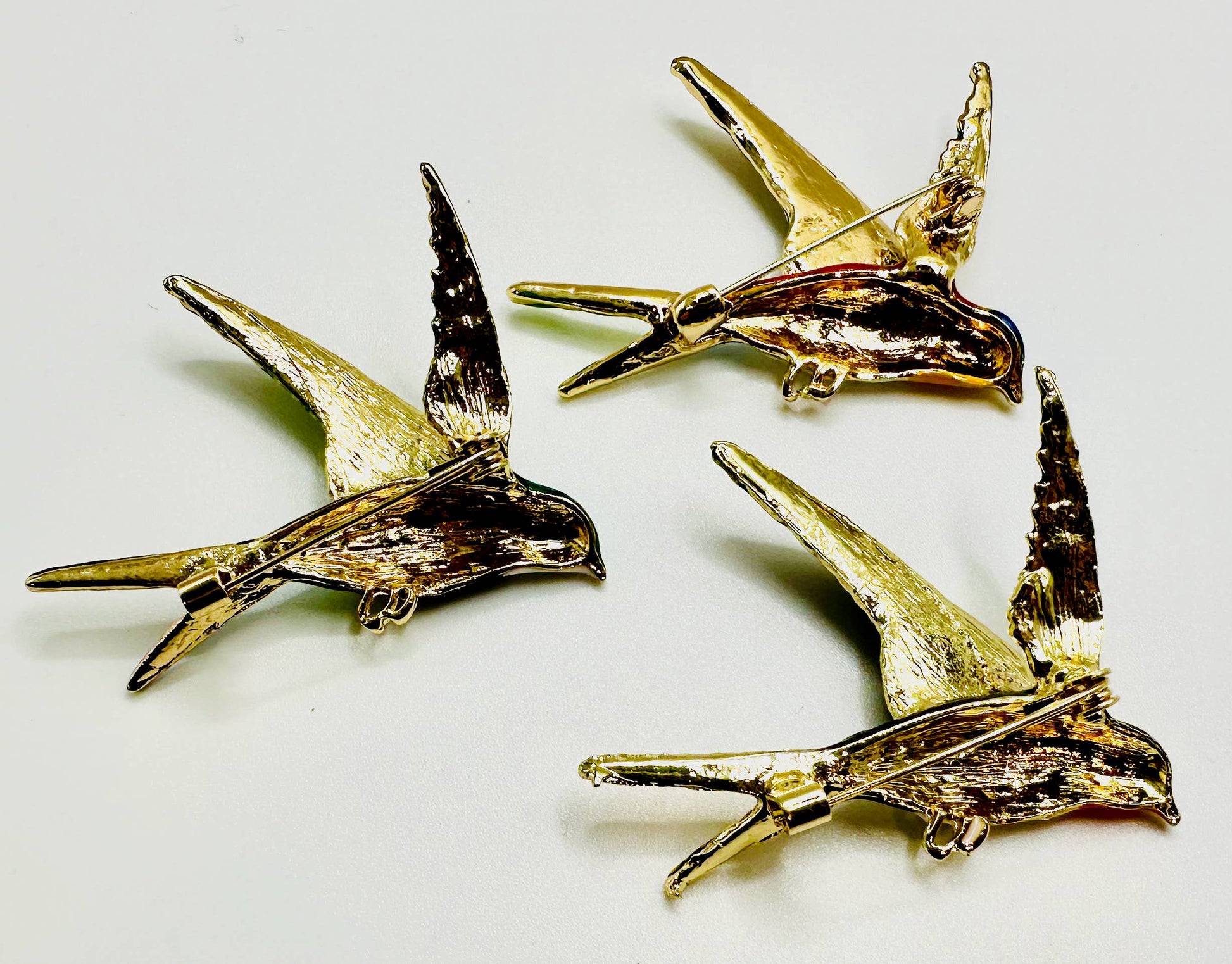 These beautiful enameled metal song bird brooches are about 2" x 1/2" (varies slightly, due to the variety.