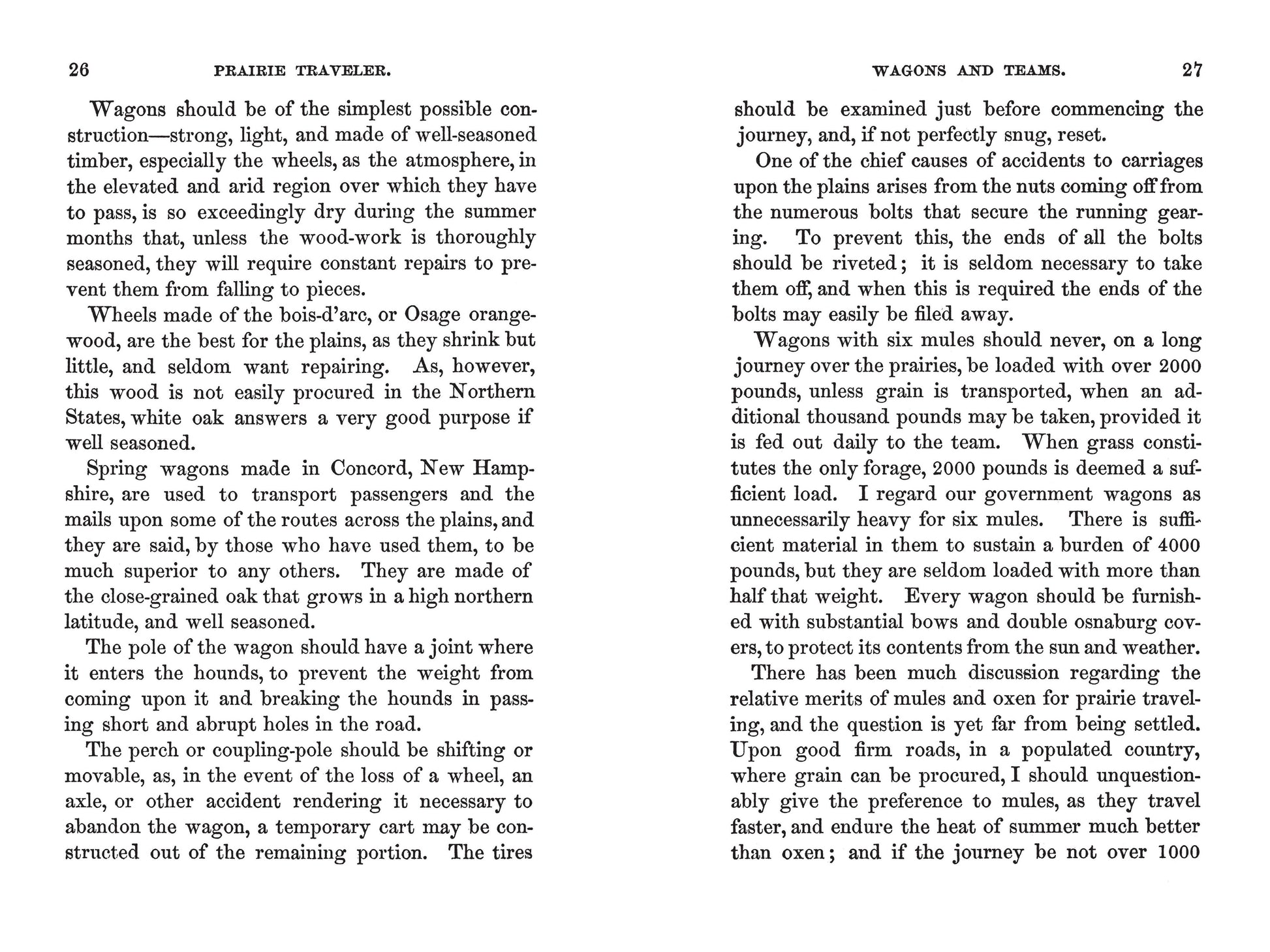 Originally published in 1859, The Prairie Traveler became the principal manual for westward-bound pioneers. At the time that he wrote the book, Randolph B. Marcy (1812-1889) was a Captain of the U.S. Army. Because he was an excellent writer and had spent much of his military career in the American West, Marcy was asked by the War Department to write this guide.