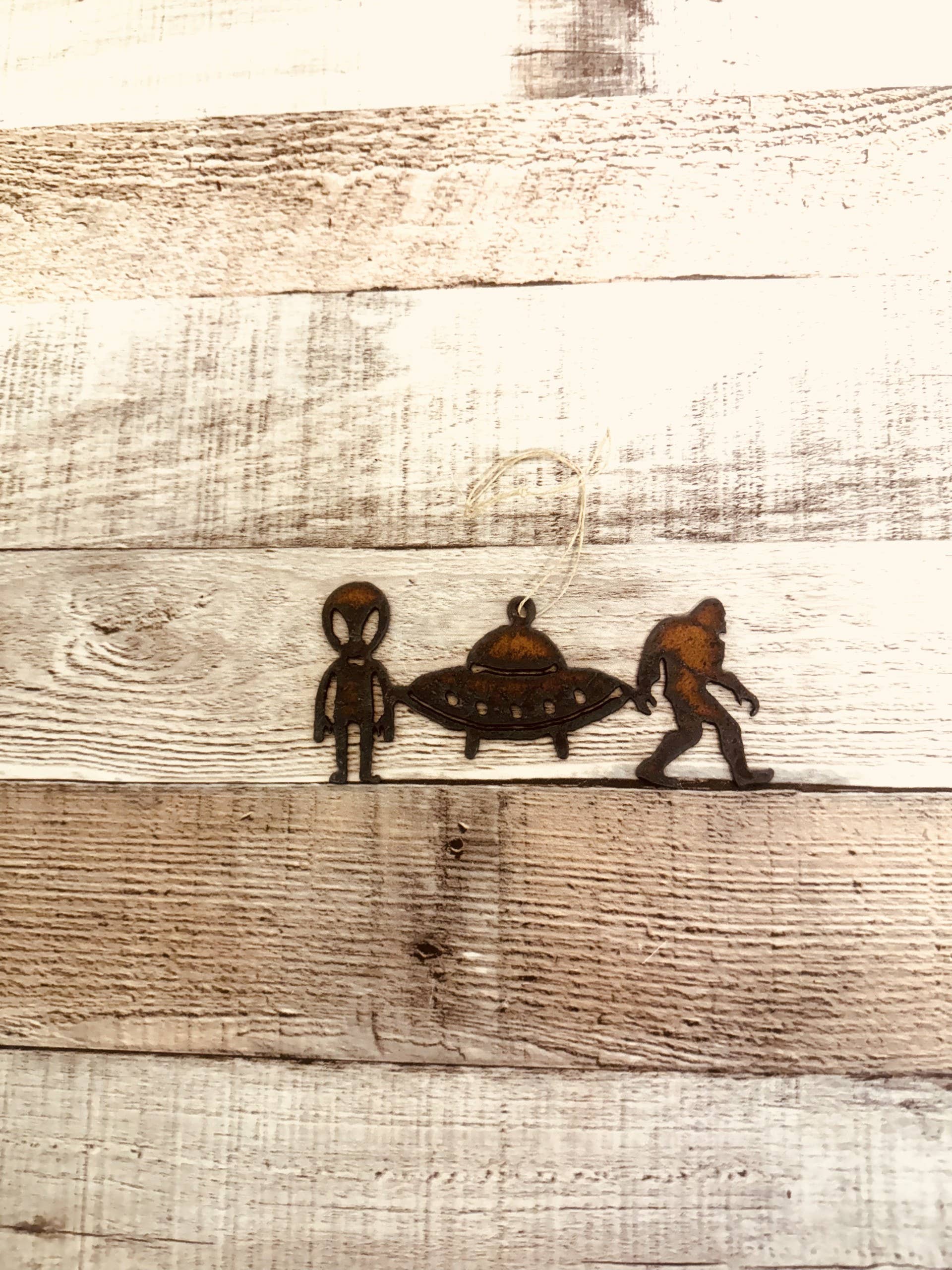 UFO Scene Area 51 Bigfoot flying Saucer and Alien Ornament