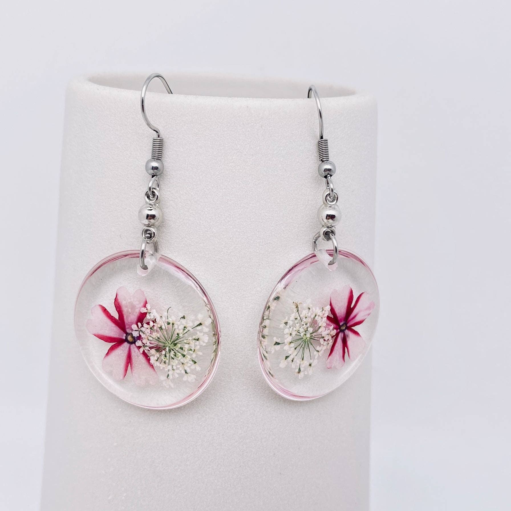 These lightweight and charming earrings seamlessly blend the unique charm of verbena with the delicate allure of Queen Anne's Lace, making them a perfect accessory for various occasions.