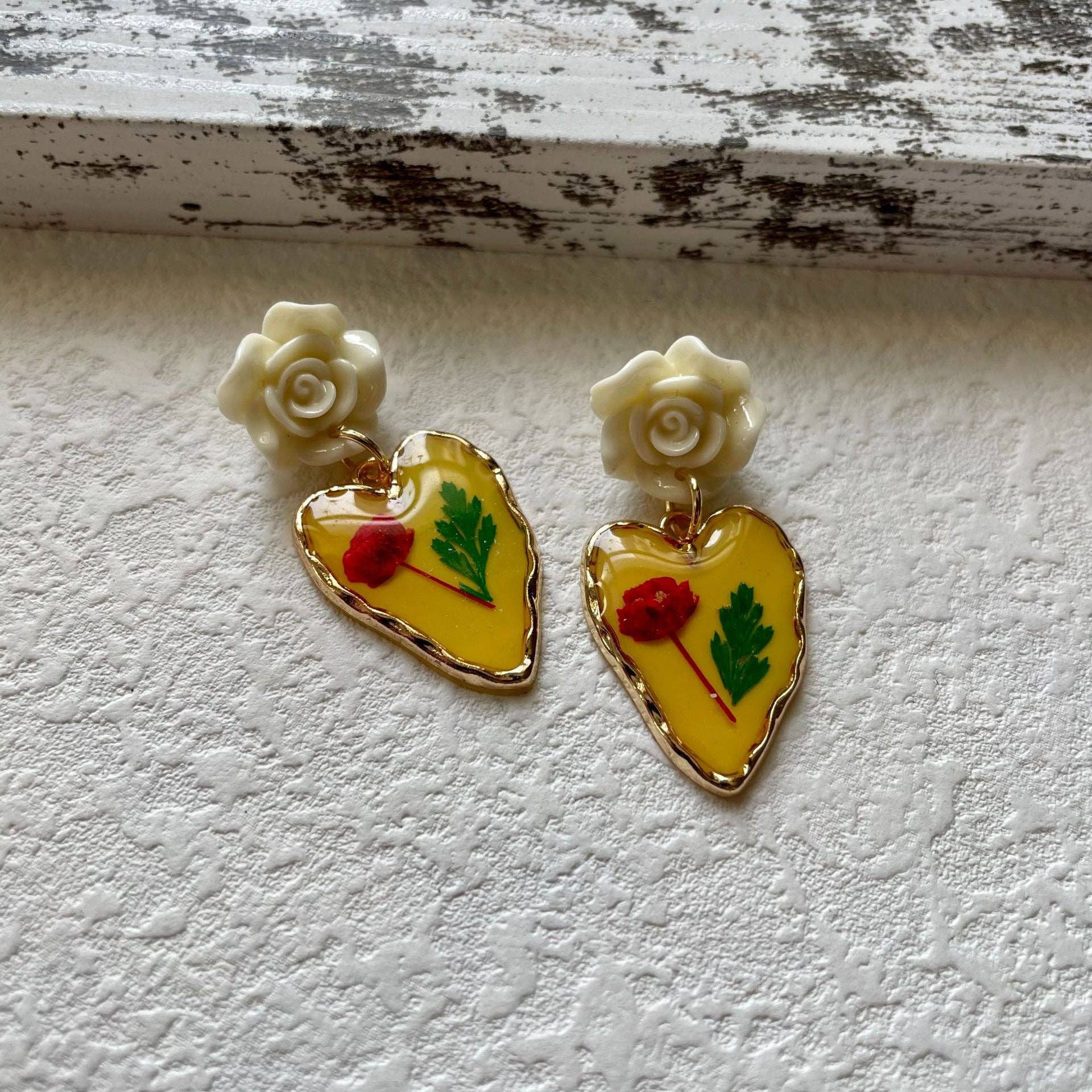 Sunny Nostalgia – Combines antique gold hearts with preserved dried roses in vibrant yellow for retro summer charm. Artisan Texture – Each petal showcases real epoxy-encased florals, creating unique organic depth. Statement Sweetness – Pops against straw hats, linen dresses, or slip skirts like wearable sunshine. These heirloom-inspired earrings capture the romance of a rustic garden party—full of whimsy and warmth.